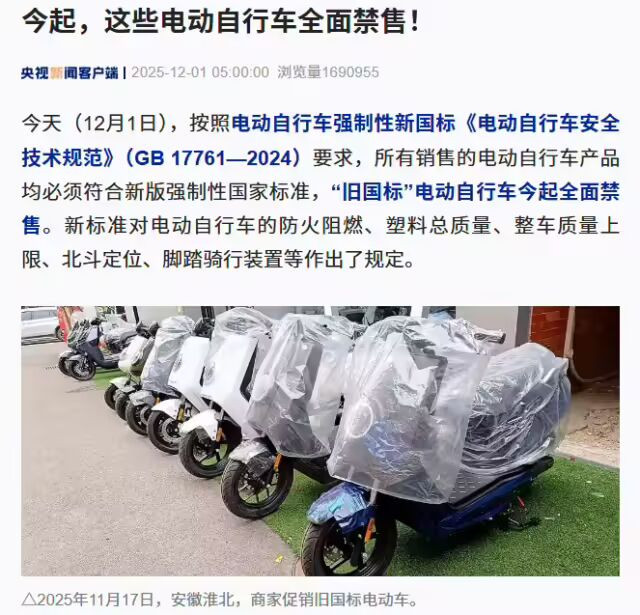根据《国家认监委关于严格电动自行车强制性产品认证管理的公告》,12月1日起,所有销售的电动自行车产品均必须符合新版强制性国家标准配资之家官网,即《电动自行车安全技术规范》(GB17761—2024),“旧国标”电动自行车全面禁售。