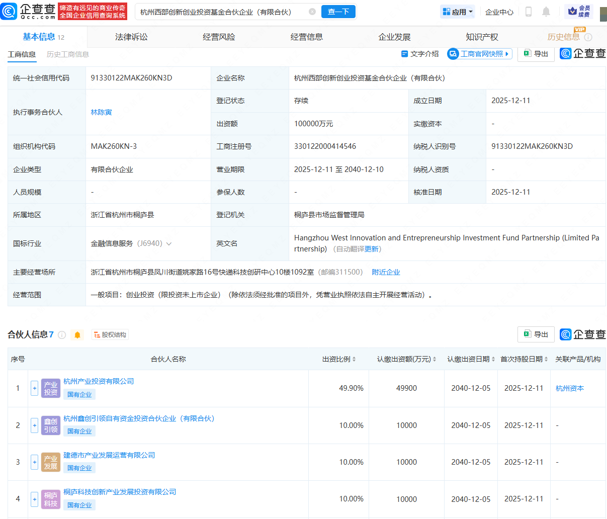 近日昆明配资炒股,杭州西部创新创业投资基金合伙企业(有限合伙)成立,出资额10亿人民币,经营范围为创业投资。企查查股权穿透显示,该合伙企业由杭州产业投资有限公司、桐庐科技创新产业发展投资有限公司、杭州资向未来企业管理有限公司等共同出资。